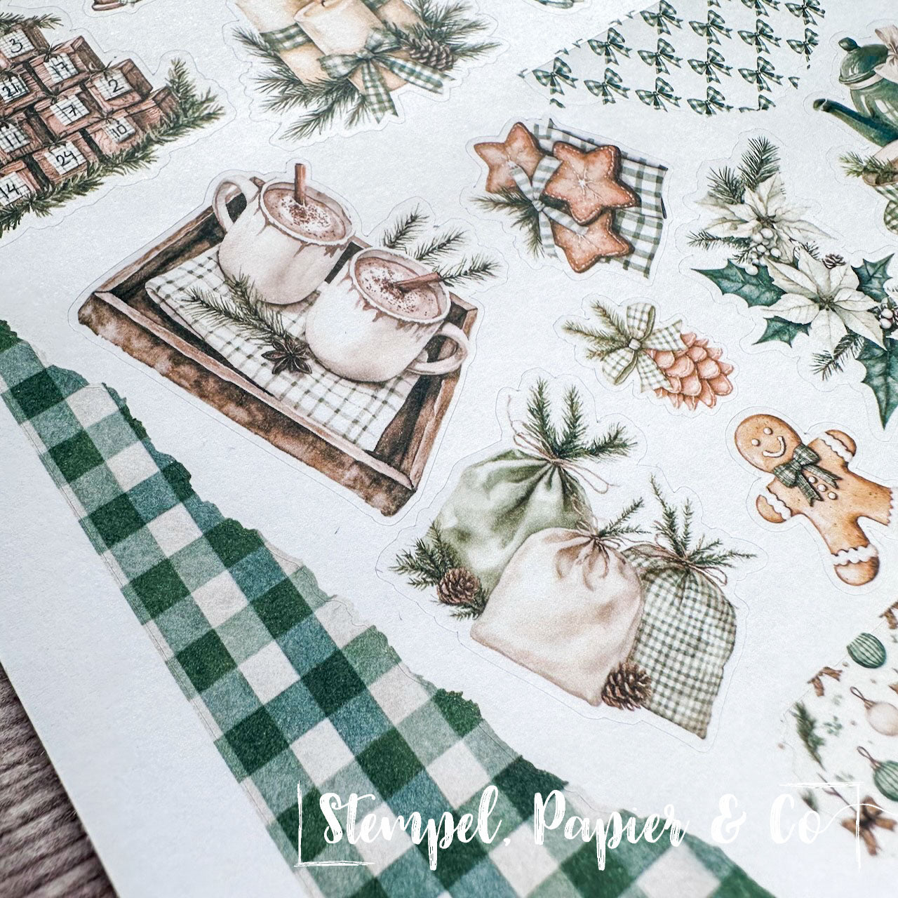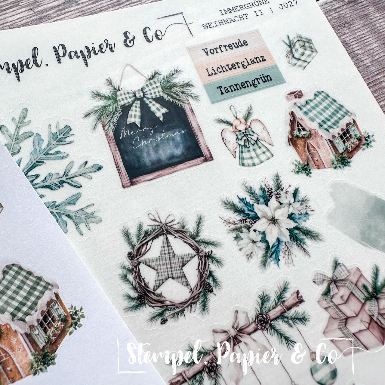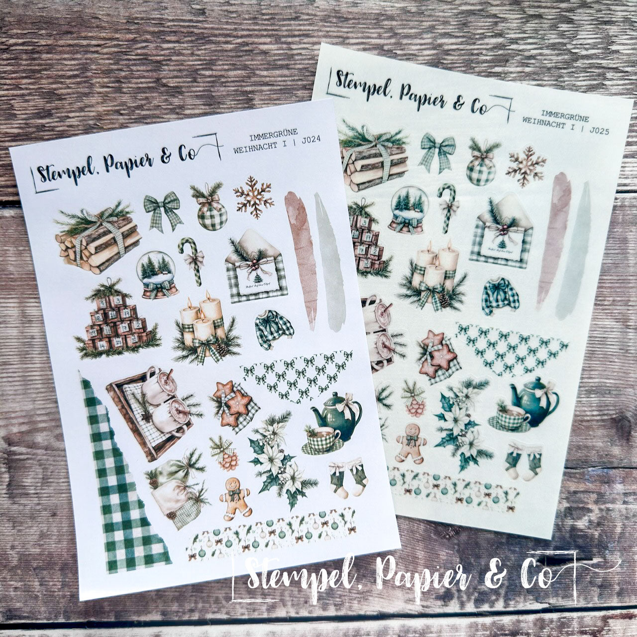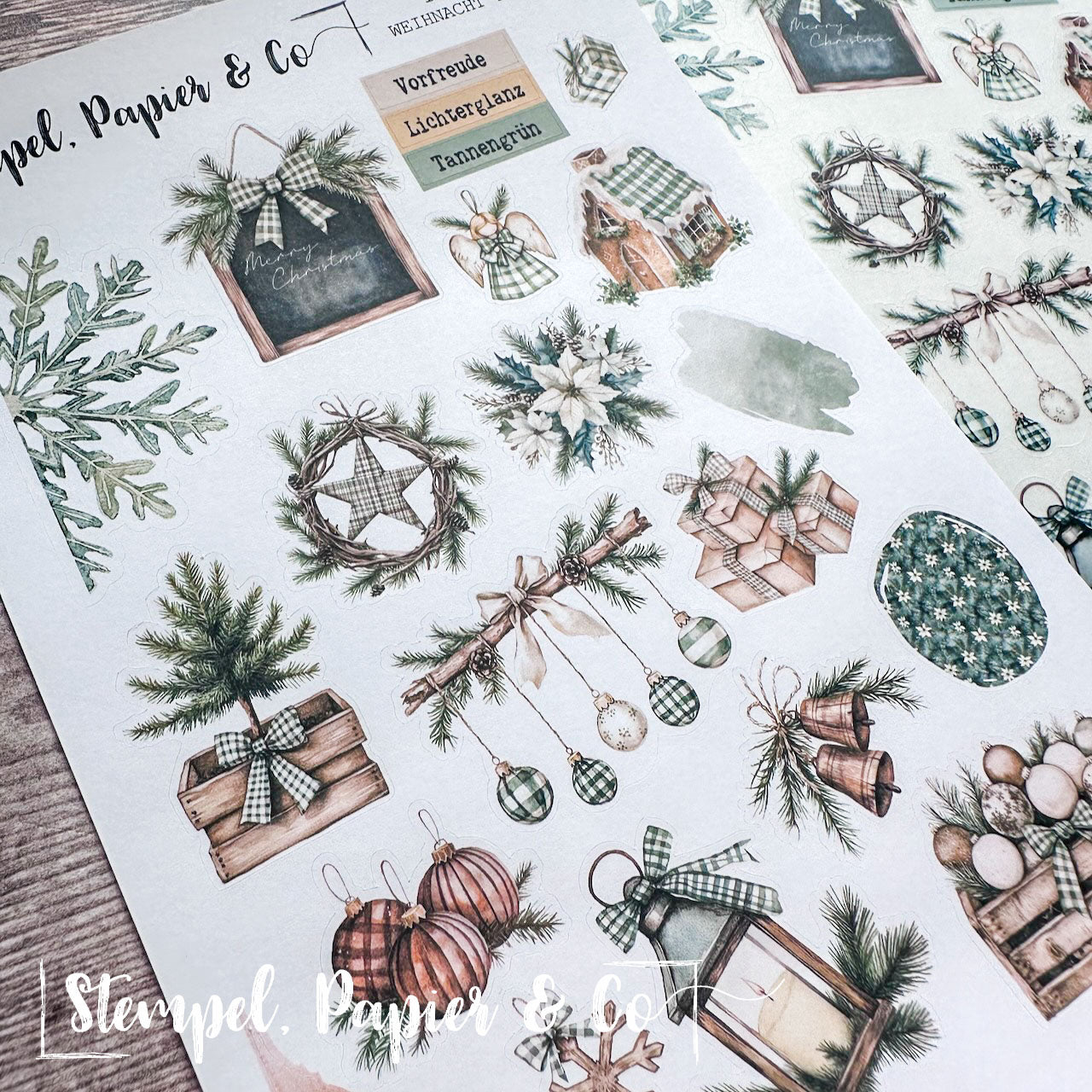 Stickerbogen in der Größe 12x17 cm "Immergrüne Weihnacht" in zwei verschiedenen Varianten mit weihnachtlichen Elementen in Grüntönen, immergrünen Bäumen wie Tanne und Kiefer, Ornamente, Geschenke, Kranz sowie sowie Washitape, Dekoboxen und mehr zur Dekoration für Deinen Planer, Kalender oder Journaling.