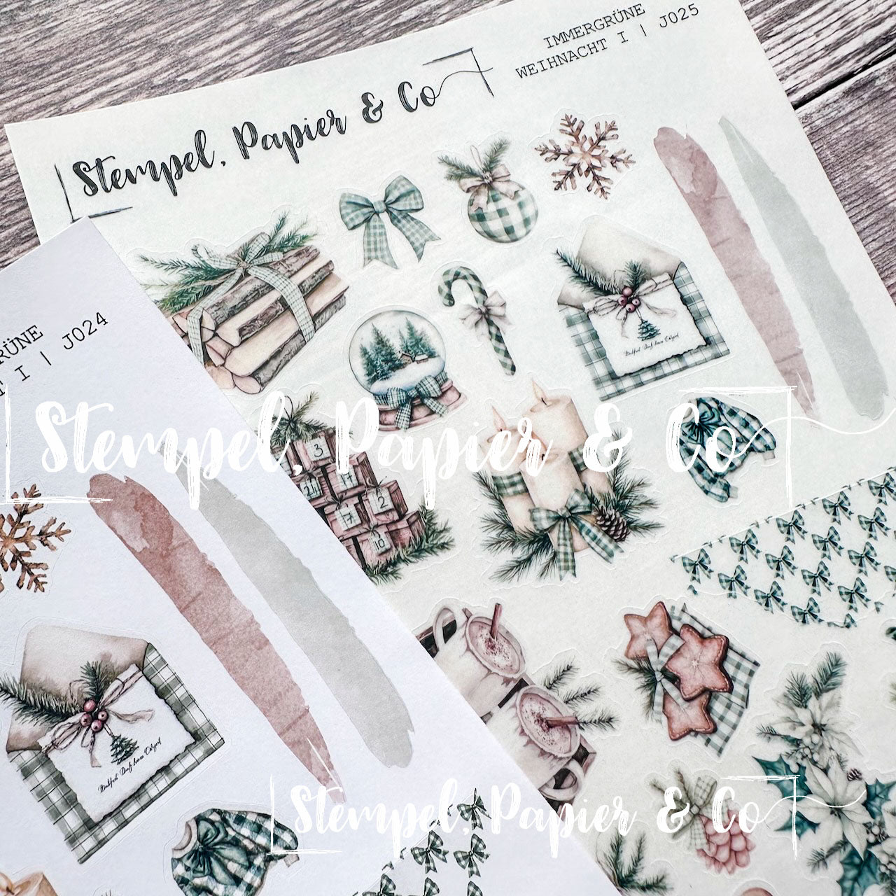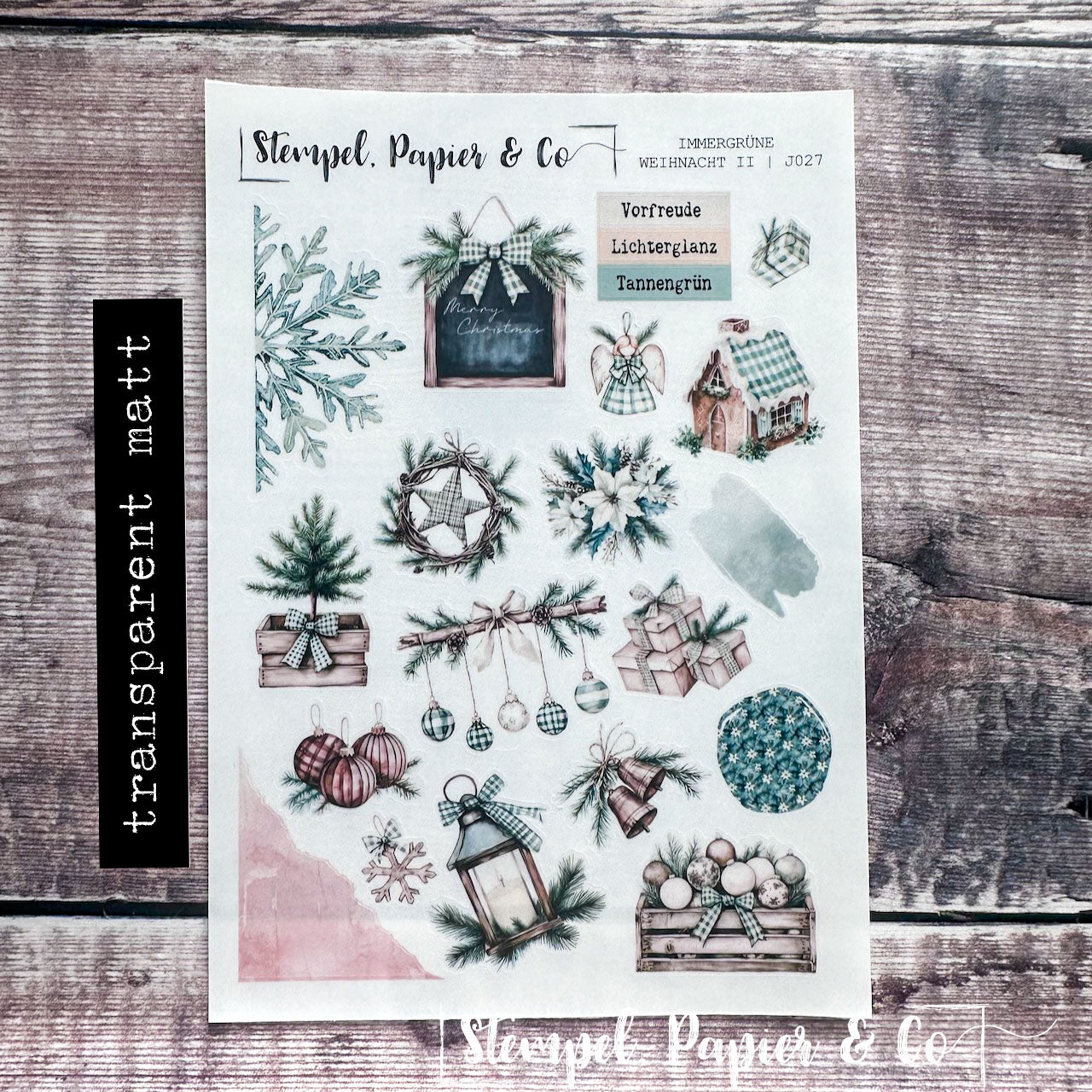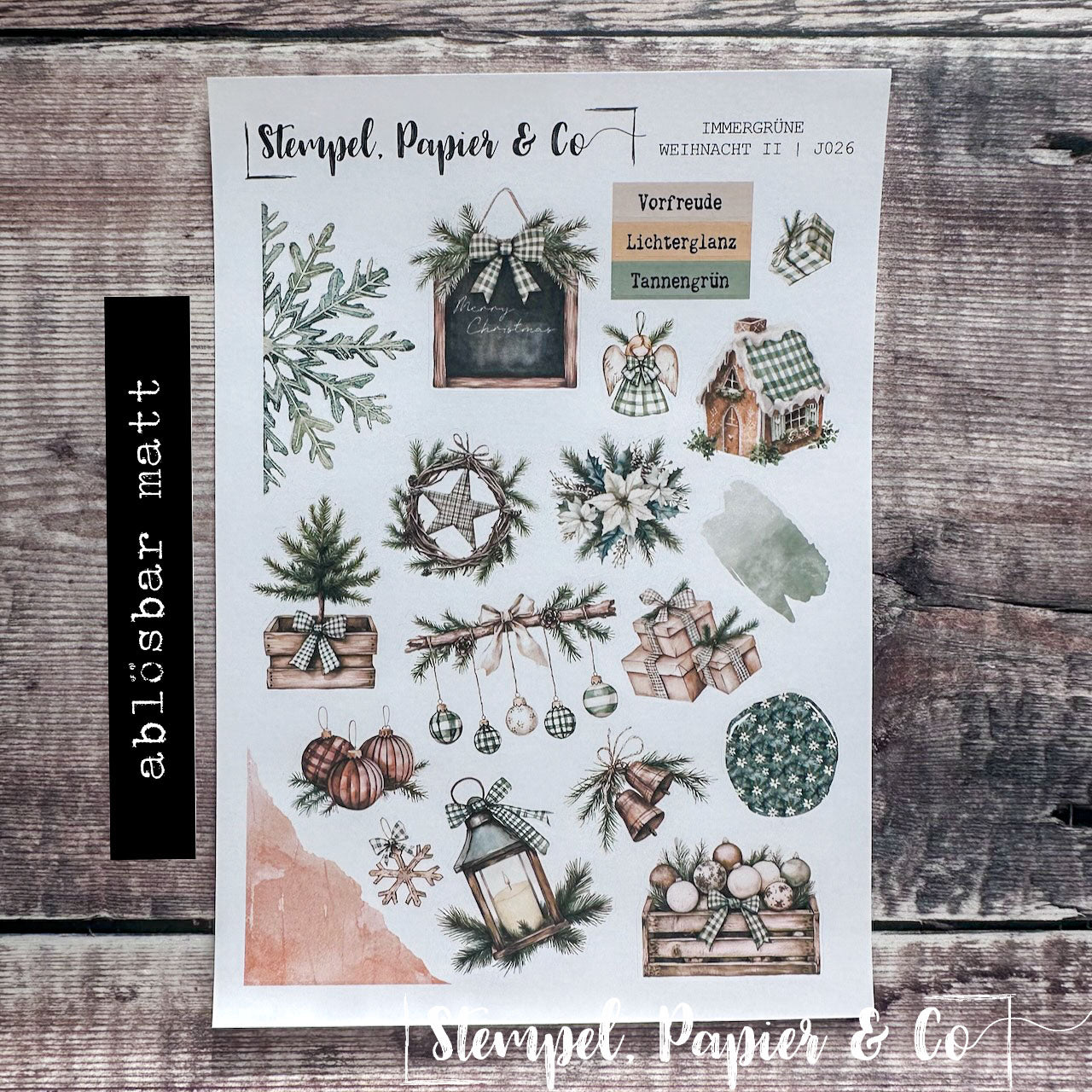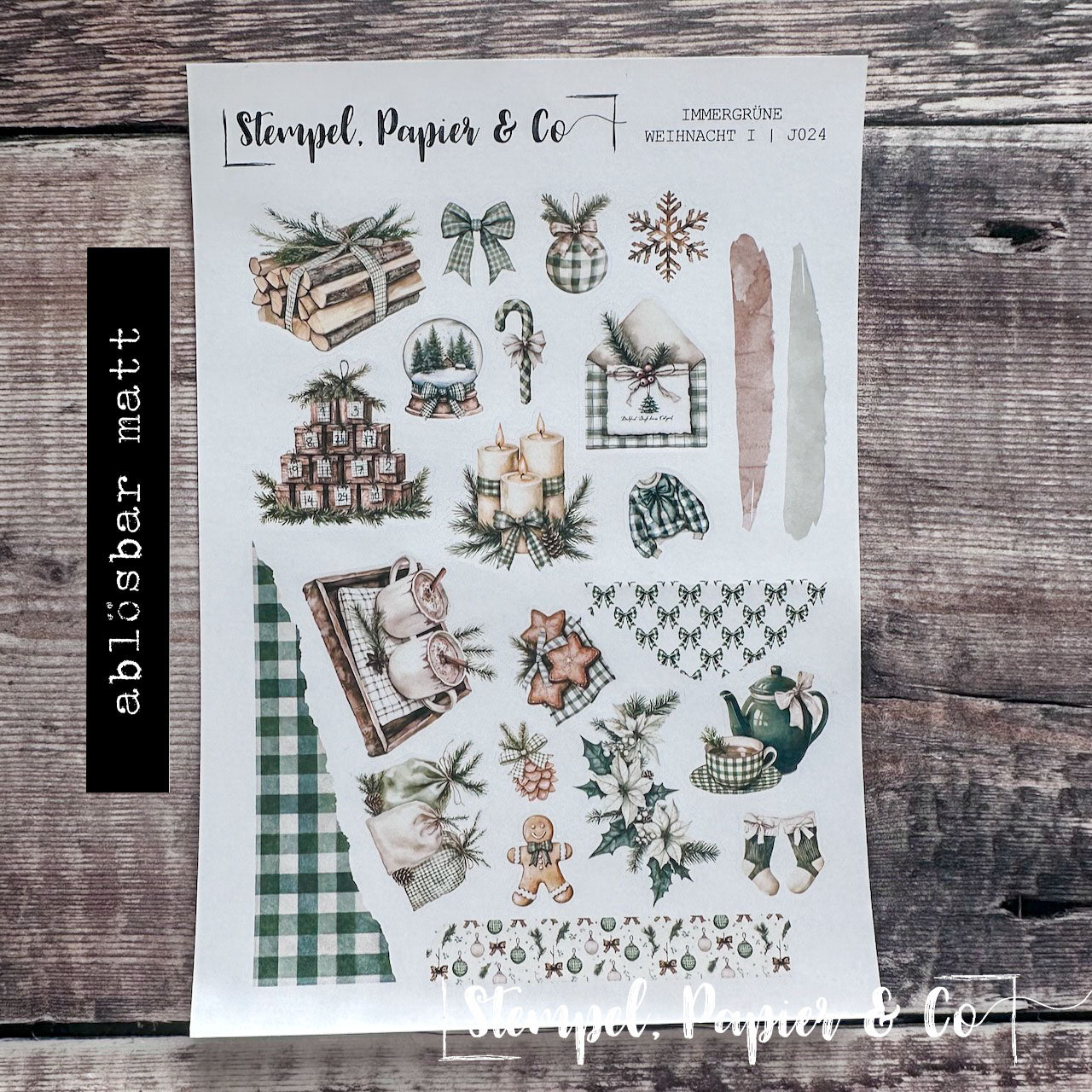 Stickerbogen in der Größe 12x17 cm "Immergrüne Weihnacht" in zwei verschiedenen Varianten mit weihnachtlichen Elementen in Grüntönen, immergrünen Bäumen wie Tanne und Kiefer, Ornamente, Geschenke, Kranz sowie sowie Washitape, Dekoboxen und mehr zur Dekoration für Deinen Planer, Kalender oder Journaling.